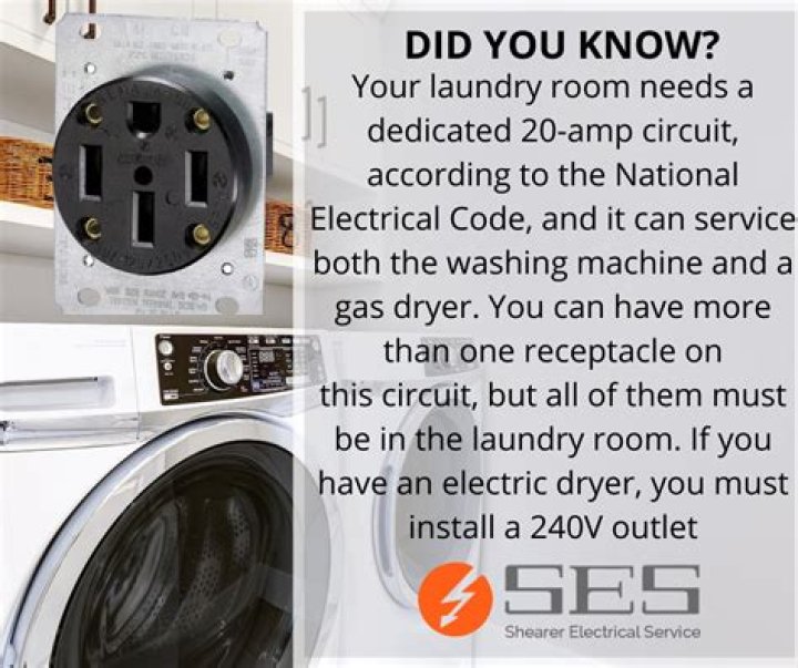 In the Laundry RoomYour laundry room should have a dedicated circuit of at least 20 amps. If you have a gas dryer, both your washing machine and gas dryer may be plugged into the same outlet. If you have an electric dryer, it will need its own dedicated 20-amp, 220-volt circuit.