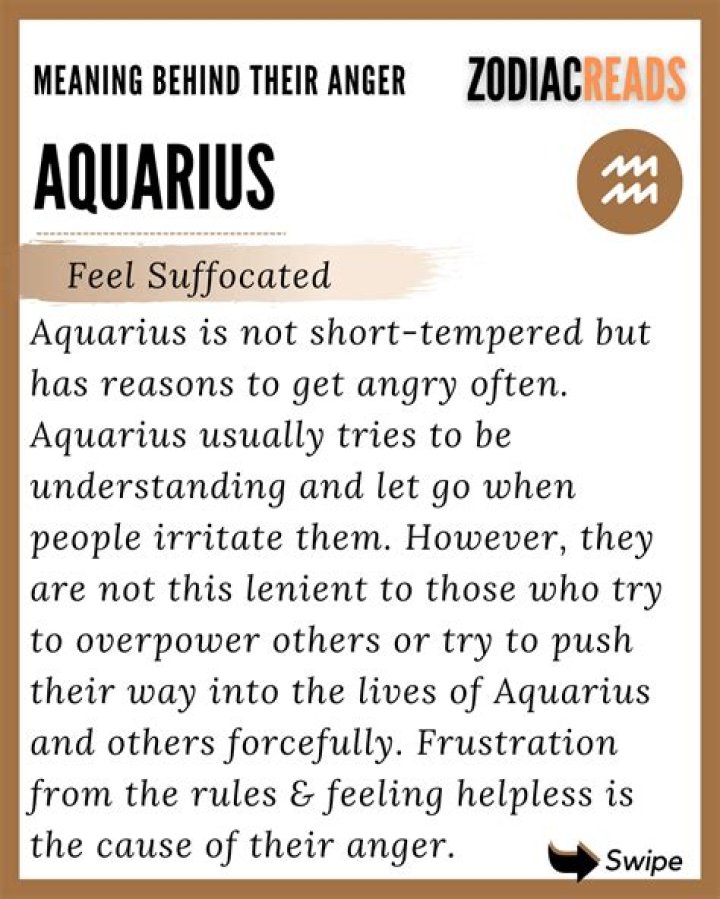 Aquarius has one answer to anger or conflict: run. When it comes to anger, Aquarius would much rather head for the hills and do their own thing than hash things out, so don't expect to hear the words “we need to talk” from this sign anytime soon.Can Aquarius be angry?