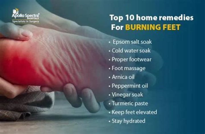 Soak your feet in a solution that contains Epsom salt or apple cider vinegar (ACV) for up to 20 minutes. Epsom salt is a mineral compound that contains magnesium sulfate. Magnesium sulfate has therapeutic benefits that can provide burning feet relief.Should I be worried about burning feet?