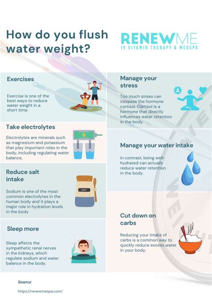 Water weight is not usually a cause for concern, but it can be uncomfortable and recurring. Reducing salt and carbohydrate intake, keeping hydrated, and frequently exercising are all good ways to lose water weight and prevent it from returning.What gets rid of water retention fast?