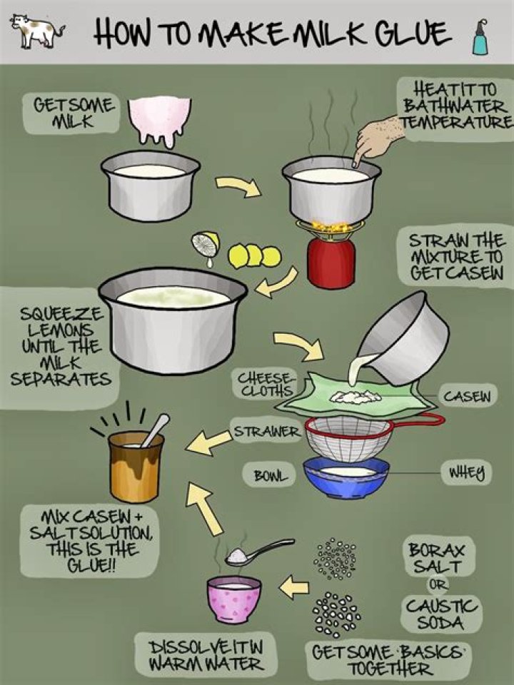 Take old cheese, and cut it into little pieces, then put them in water for two full days or more. Then grind them well on a marble stone. Then add to them almost as much good quicklime, and grind them well together, and it is the best glue; use it immediately while it is moist.How did the glue form from milk and vinegar?