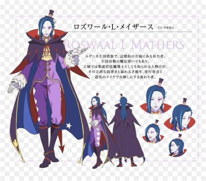 Roswaal explaining his reason for living. Roswaal L. Mathers (originally born as Roswaal A. Mathers) is a major anti-villain in the 2014 Japanese dark fantasy light novel series Re:Zero − Starting Life in Another World, as well as its 2016 anime television series & 2014 manga adaptations of the same name.