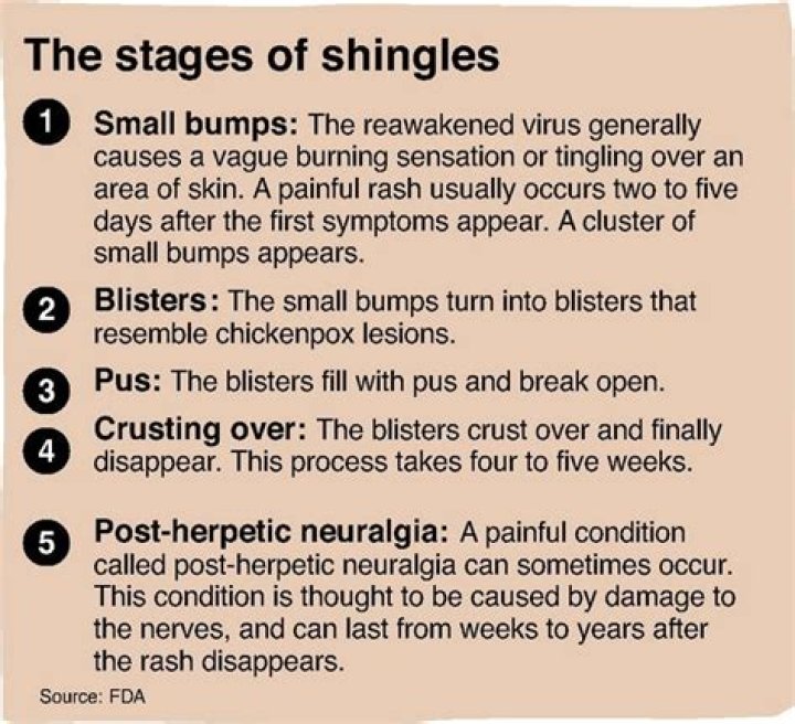 1–5 days: A person may experience tingling sensations on one side of the body or head. 1–5 days: Areas of tingling may become painful or flushed in appearance. The next 7–10 days: A person experiences painful blisters. Within 5 weeks: The blisters and pain typically resolve.What are the signs that shingles are healing?
