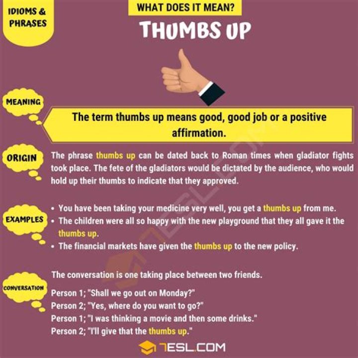 : a gesture in which you hold your hand out with your thumb pointed up in order to say yes, to show approval, etc.What Does Thumbs Up Mean?
