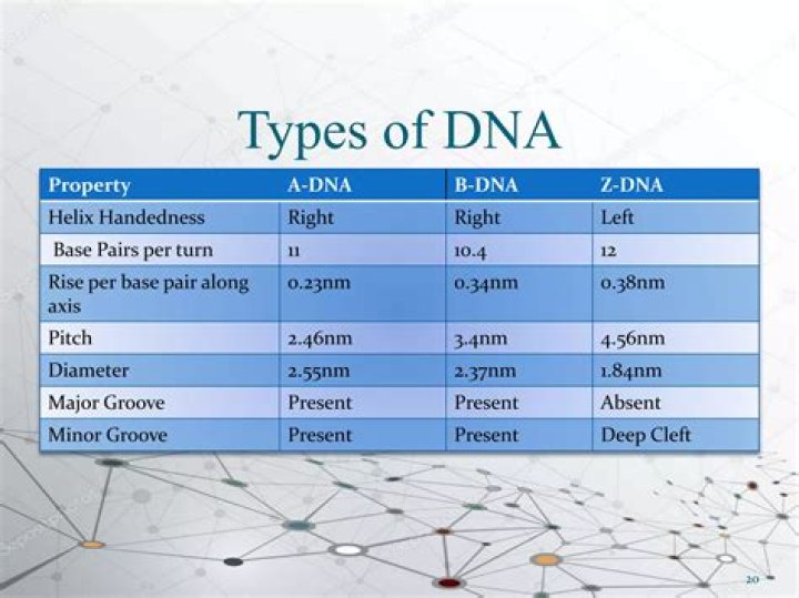 Z-DNA is one of the many possible double helical structures of DNA. It is a left-handed double helical structure in which the helix winds to the left in a zigzag pattern, instead of to the right, like the more common B-DNA form.What are the 3 types of DNA?