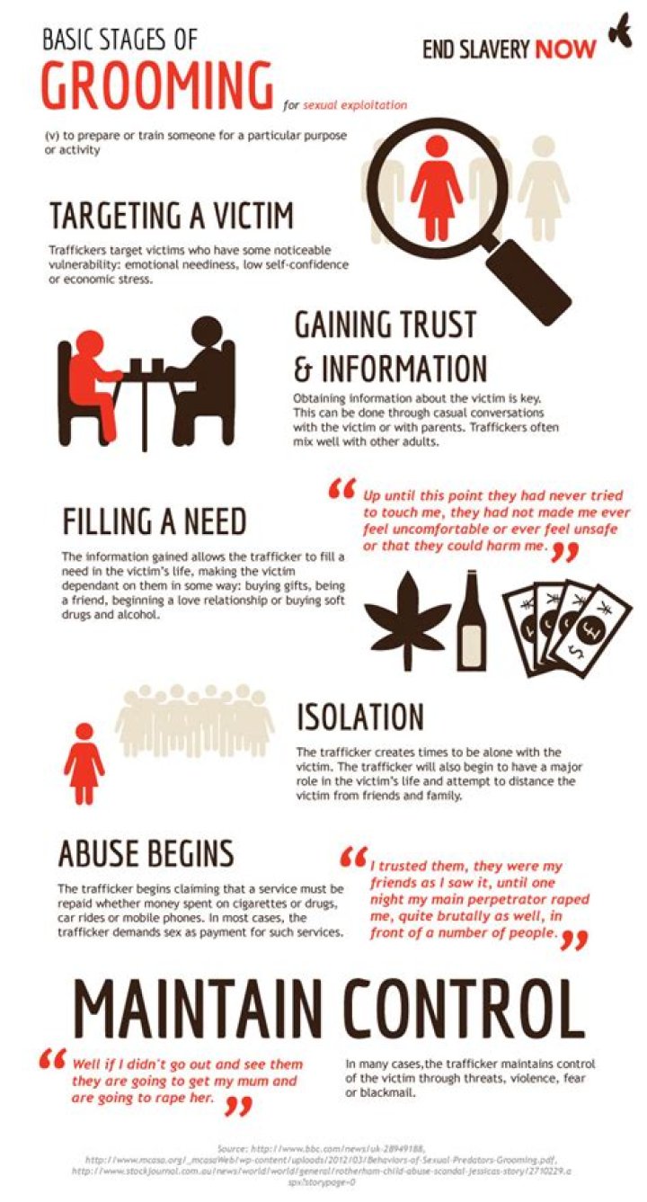 What is grooming? Grooming is when a trafficker or scout finds and slowly prepares a young person, typically aged 11 – 15, for a particular purpose through trust and relationship building. Traffickers may have scouts in schools to identify kids who match their desired profile.What are the 6 stages of grooming?