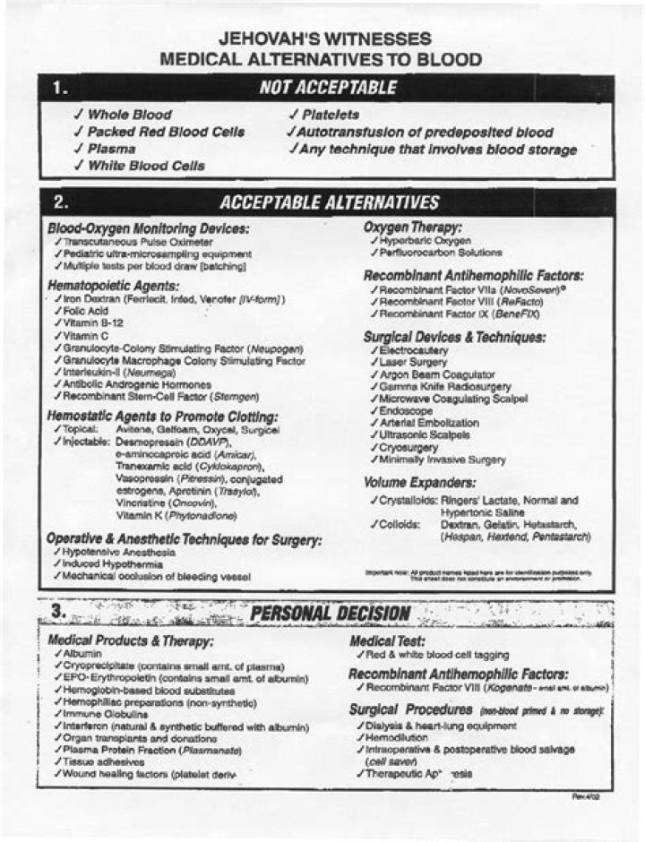 Multiple transfusion alternatives have been developed, and many are generally acceptable to a Jehovah's Witness patient, including tranexamic acid, prothrombin complex concentrate, and fibrin glue.Do Jehovah Witnesses accept blood products?